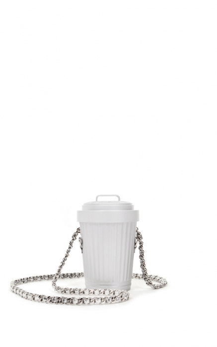 Джереми Скотт, главный по Moschino, продолжает дело Марселя Дюшана и делает клатчи на манер объектов «реди-мейд» вроде этого мусорного бачка. (Bosco)
